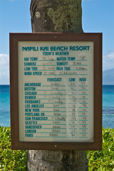 And when you are luxuriating on Maui, you hope that friends and family back home are suffering with miserable winter weather — making them as envious of you as possible. Napili Kai helps by providing the weather report for various cities on the mainland. And aren't you glad you are not in Fairbanks? |