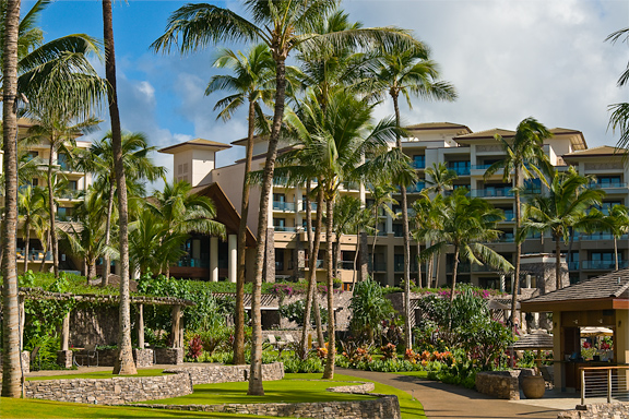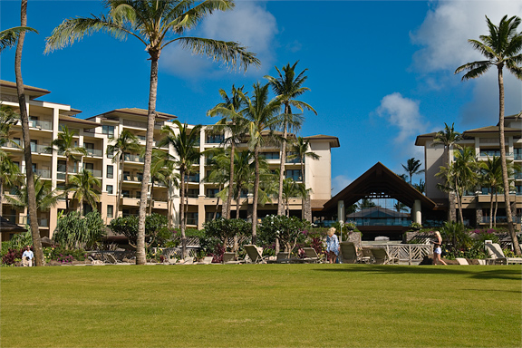 One of the aspects of Hawai`ian landscaping that makes a property look nice quickly is the ability to transplant large coconut palms easily. They have a small root ball and lacking the elaborate branching of other trees, they are light and easy to transport, lift and place. Looking at this image, you would find it hard to believe that a year earlier, the common area was just bare ground. |