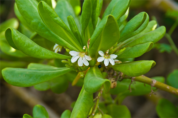 You may recall the naupaka from the earlier issue on Mo`omomi. Those plants struggle to survive. These plantings are quite healthy due to irrigation and care from the Kapalua landscaping staff. |