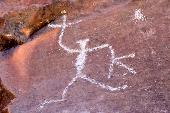 Two more — but I really wonder if these are ancient or just modern graffiti in a similar style as the petroglyphs. The one on the left did not appear to have been completed but maybe a quick attempt. The one on the right is too anatomically correct. Additionally, they were in a different area of the rock face from most of the petroglyph. For these reasons, I am skeptical. |