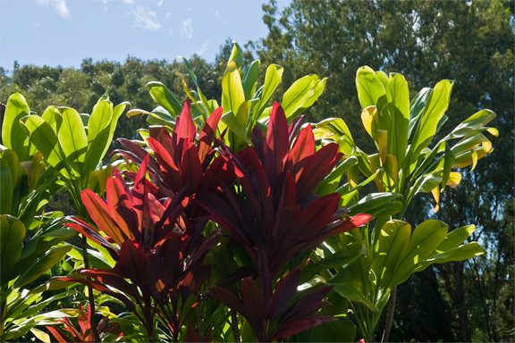 Many people know these plants by sight if not by name since they are commonly used for landscaping in areas which do not get too cold. In Hawai`i they are called Ti Plants — with "Ti" pronounced like "Tea", the beverage. My sister tells me that in Florida the red ones are called "Pink Sisters". |