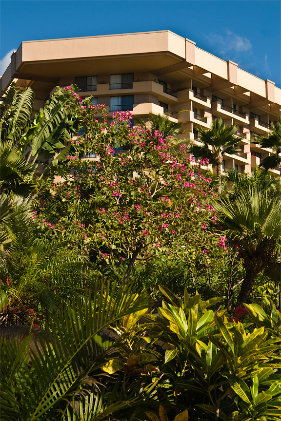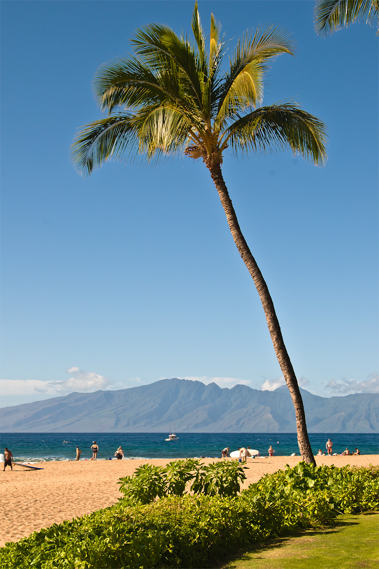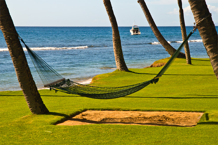 The pool at the Hyatt Regency on a lazy Maui afternoon. I mentioned earlier that this was one of the first mega-pools — a huge irregularly-shaped pool that meanders all over the resort property with waterfalls and water slides. Looks inviting — but you must have a Hyatt room key to swim here — and they do check.