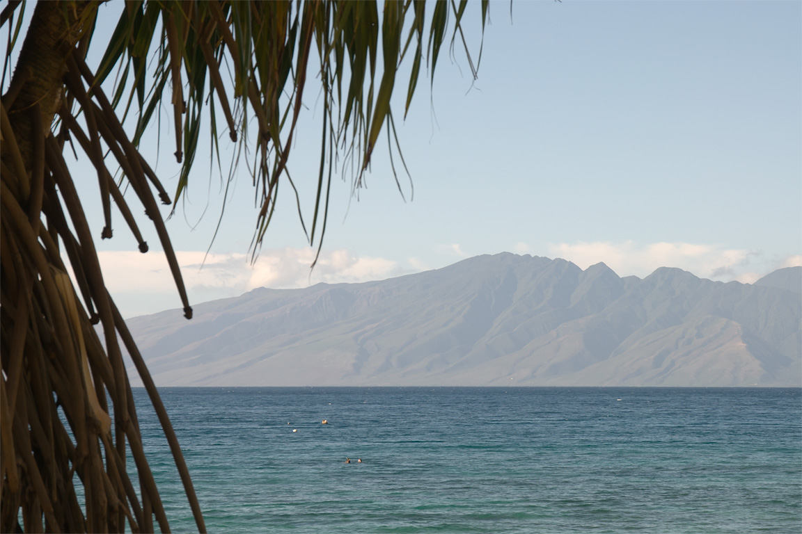 A few spots along the path reward you with shots like this — coconut palms with Moloka`i in the distance. |
