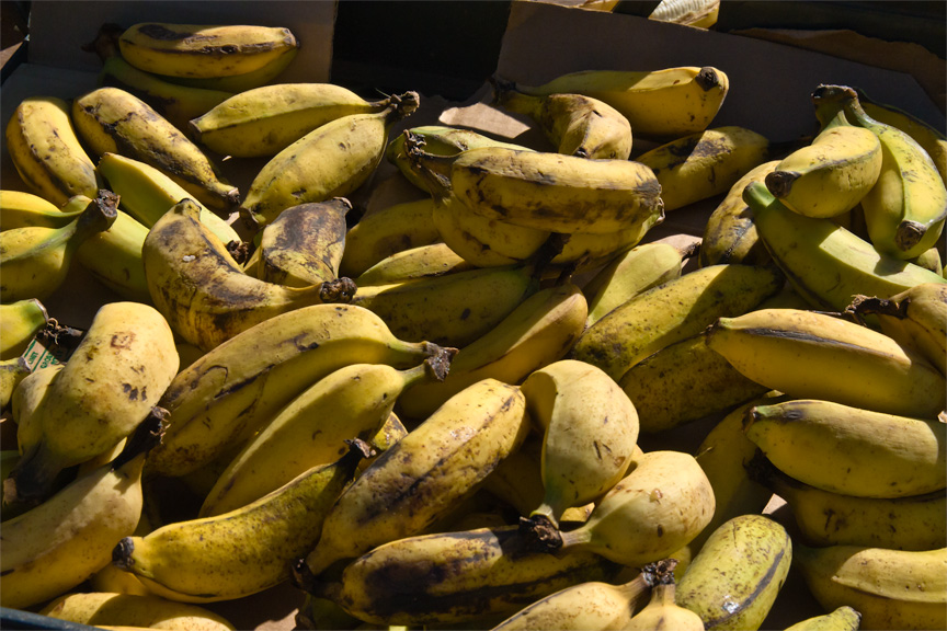Ah, here is one of my favorite treats — apple bananas. This variety has more taste than the bananas we purchase on the mainland. This species intrinsically has more flavor but also the fruit is picked when ripe or nearly so — unlike those on the mainland which are grown in Central America, picked green, shipped to the U.S. and gassed to make them turn yellow. Result of such maltreatment of bananas is "no taste". |