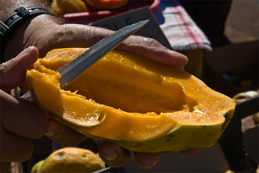 And did I forget to mention that they give free samples. Once new visitors taste the strawberry papaya, they buy them. That's why the storefront rarely has any for sale — they are all sold under the tents. |