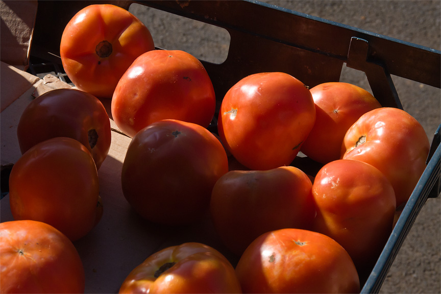 And it is not just tropical fruit but here some locally grown tomatoes. These are more like what you might raise in your home garden — big, ripe, juicy, tasty tomatoes. |