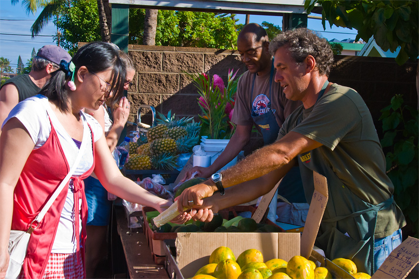 There are two locations. One is in Honokowai (between Ka`anapali Beach and Kapalua). The long-time repeat visitor will recall that they formerly sold their produce under tents on a parking lot. They still do three mornings per week (MWF) from 7AM to 11AM. However, they now also have a storefront — in what used to be (as I recall) the Honokowai General Store. The second location is at the north end of Kihei in what used to be Suda Store (former home of fantastic chow fun). Both stores have normal "store hours". You can get current information at this "Best of Maui" link. |