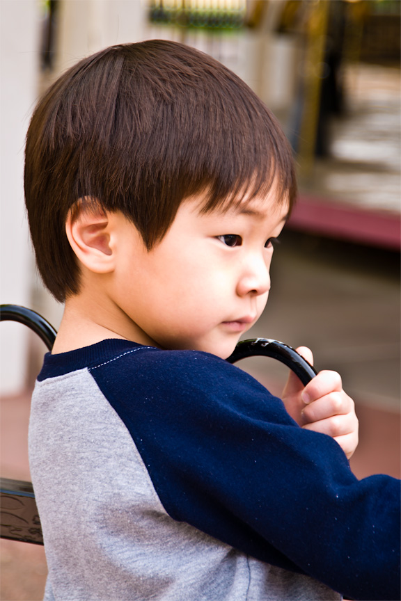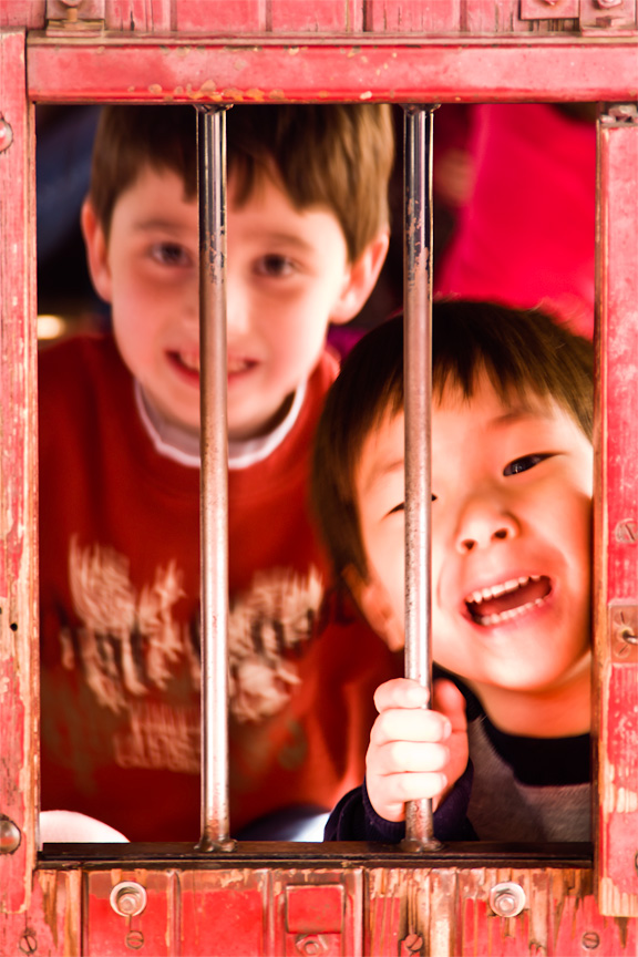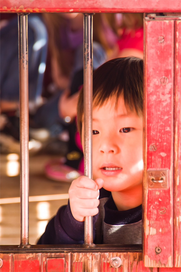 One car in the train is a boxcar, just the right size for the kids — but too small for adults. Johnny seemed a little timid inside when the train first started up, as if he were regretting his enthusiasm for jumping into the boxcar rather than sitting with me in one of the open flatbed cars. |