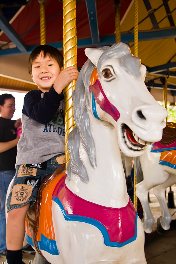 One of its attractions is an old fashioned carousel with horses that go up and down. You can tell by his grin that Johnny loves it. It runs every half hour during the week and continually on the weekends and only costs one ticket per rider. Tickets are $1.00 but can be purchased in a booklet of 12 for $10.00. |