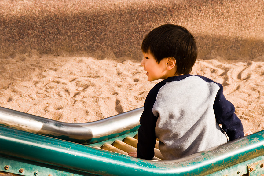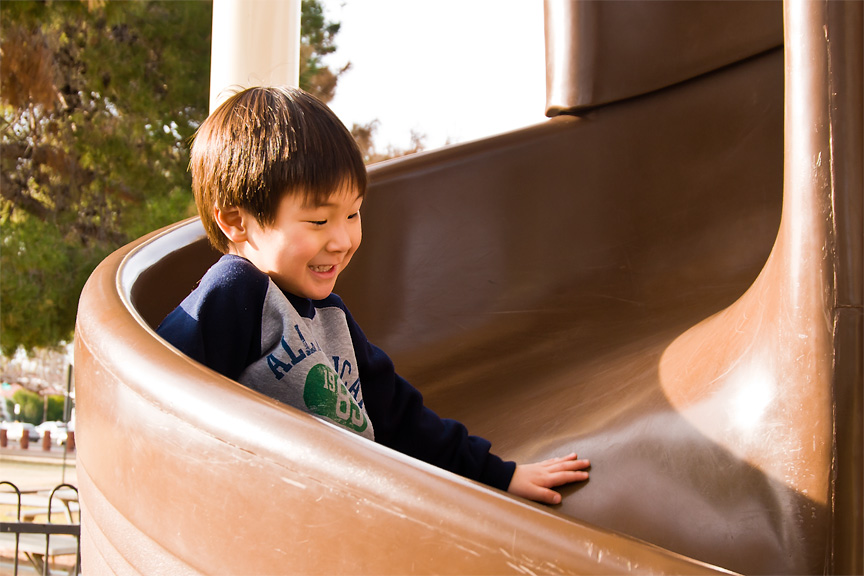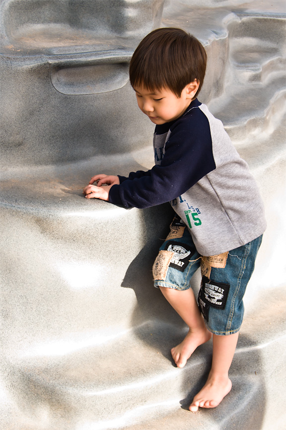 One of Johnny's favorites is a slide that uses rollers instead of a smooth surface to allow the child to enjoy gravity. On a subsequent summertime visit, I realized that the rollers also help with another playground hazard — the hot, hot surfaces on the slides. Since the rollers are kept moving by the kids going down, no one spot of each roller will get too hot in the Arizona summer sun. |