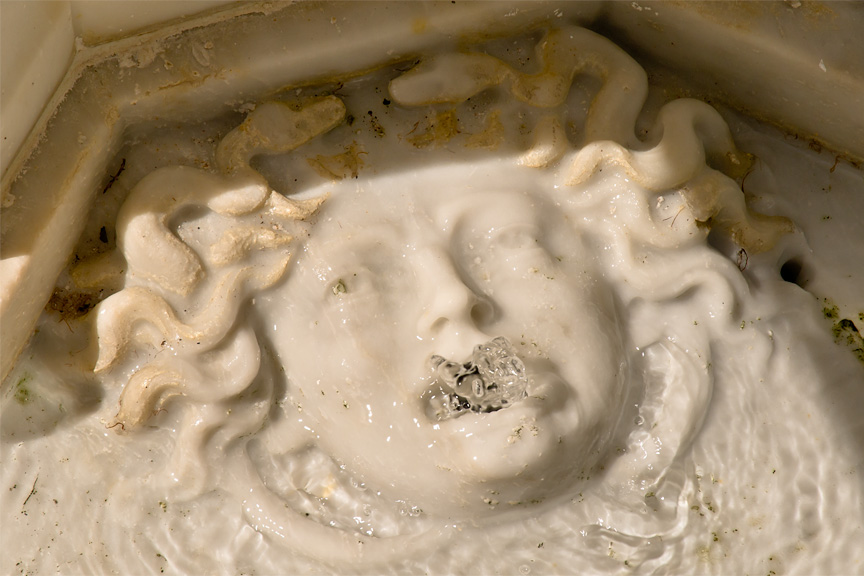 In the basin of the fountain are four figures that look like the image of a very young Medusa — the female greek monster who had snakes for hair. Here she looks a bit tamer and is spewing water from her mouth into the basin. It is hard to look fearsome under such circumstance. |
