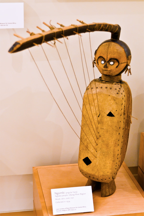 This fine instrument is a kundi or arched harp from the Zande people. It was curious to me because it almost looks like an instrument half way between a guitar-like lute and a five-string harp. |