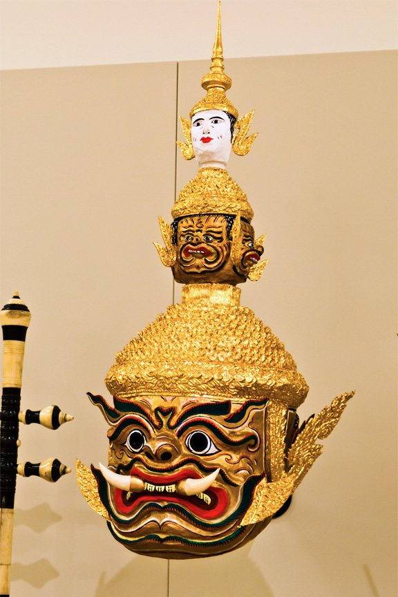 Here is a three-part mask representing various mythical creatures and used in traditional dances. The mask is fashioned of papier-mâché, gold leaf, paint and plastic.