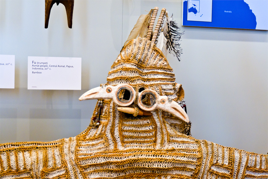The small island nation of Papua New Guinea showcases this intricately carved water drum. The tone of the drum is tuned by the amount of water added to the drum — each playing may vary in tone by using different amounts of water (intentionally or accidentally). |