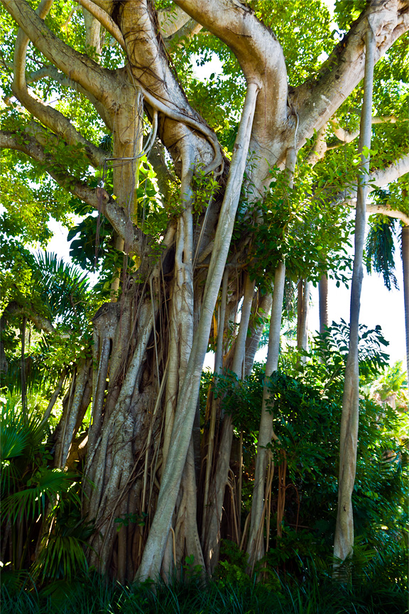 I also love banyan trees with their aerial prop roots that grow into thick woody trunks which, with age, can become indistinguishable from the main trunk. Old trees can spread out laterally using these prop roots to cover a wide area. Perhaps my affection is related to the huge Banyan tree found in the center of Lahaina, Maui.