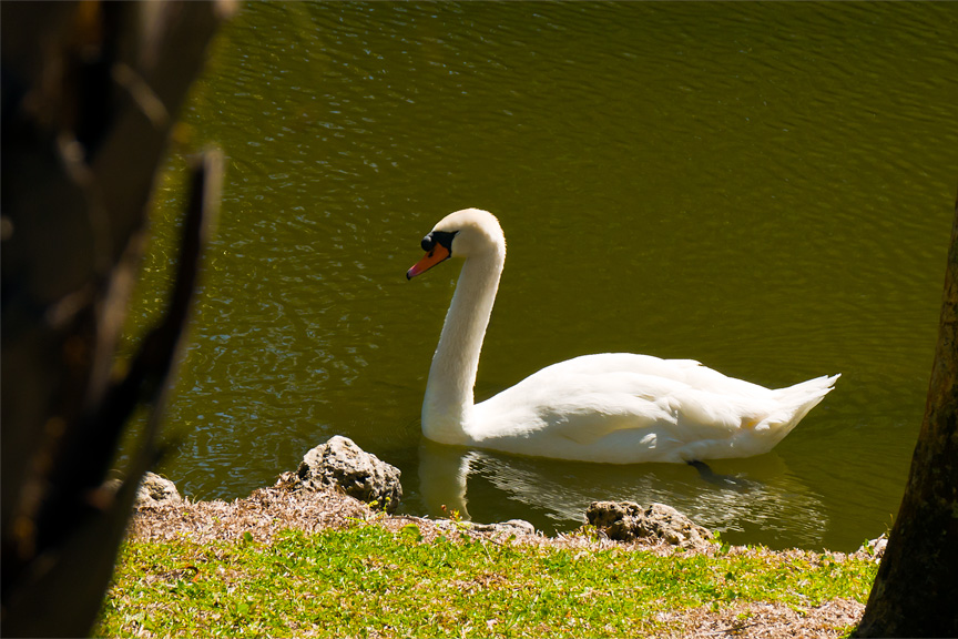 Mrs. Bartlett's love for orchids was matched only by her love of animals. The Bonnet House collection includes two Amazon parrots that reside in the courtyard aviary, Peaches, a Moluccan cockatiel housed in the fowl pen, and a mating pair of mute swans that grace the Bonnet House sloughs and Lily Pond. Other animals found on the grounds include a troop of wild Costa Rican squirrel monkeys, gopher tortoises, and manatees that occasionally seek refuge in the estate's Boathouse Canal.