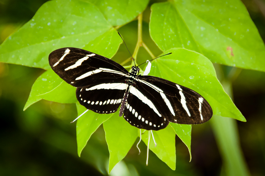 The wing pattern of the Zebra Longwing makes me think of a formal tuxedo. The true story is that the boldly striped black and white wing pattern is aposematic, warning off predators.