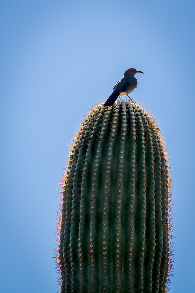 Returning to the main part of the garden, I spotted a bird sitting atop a saguaro cactus. I assumed it was a Cactus Wren but when I looked closely, it has a different color pattern on its feathers and the beak is longer and more curved. Searching online for a hint, I concluded it is probably a Curved Bill Thrasher. If anyone knows for sure, please let me know and I'll update this description online. I really like this back-lit shot but it did make bird identification that much more difficult.