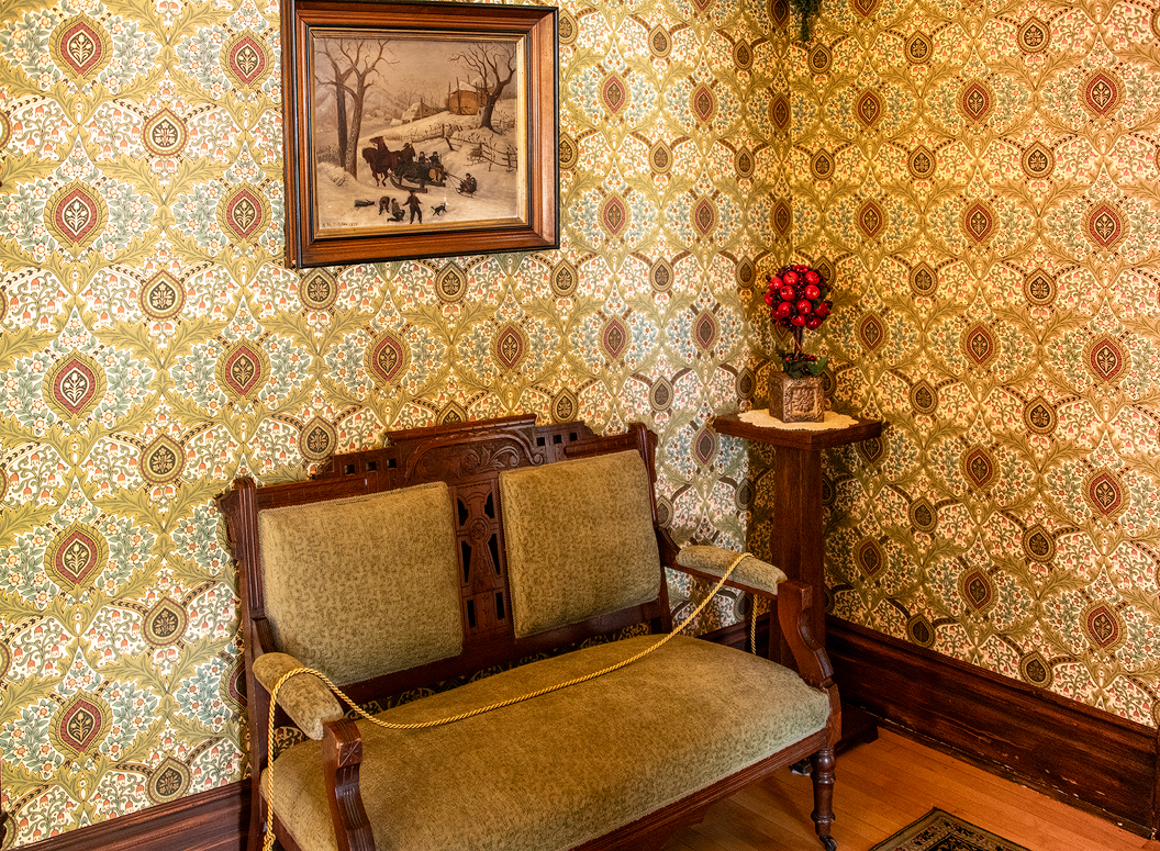 I love the period furniture but when I began processing this photo I spotted a problem I had not seen when I shot it. The picture was crooked! Well, Photoshop to the rescue. It has a new feature that allows me to point to something in the image and designate it as an object. I can then rotate the object so that it is level — and Photoshop changes the picture's perspective and fills in the wallpaper pattern in areas that had been previously covered. How could that program be so smart? I don't know but I love it.