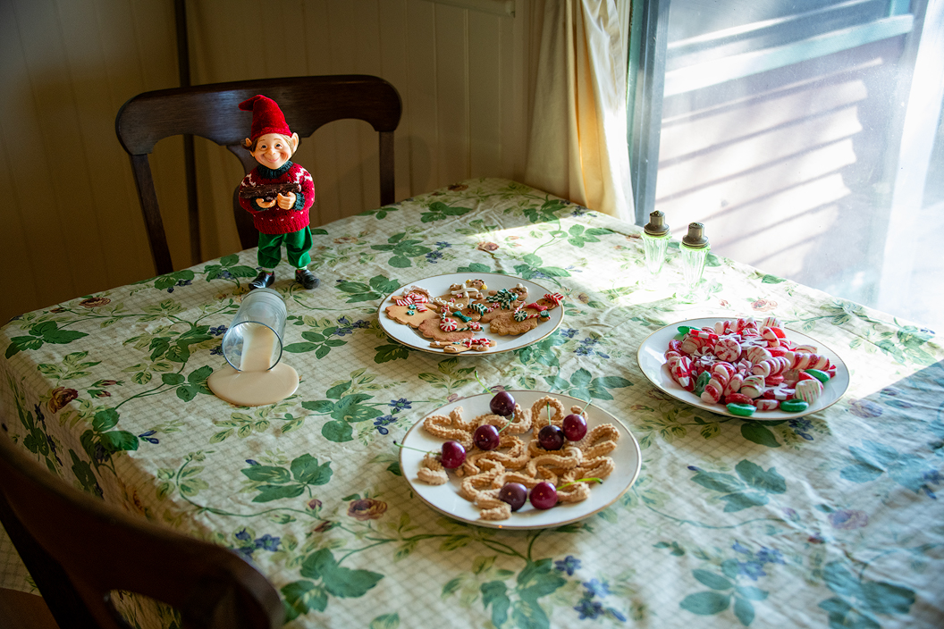 In the kitchen was a Christmas elf guarding the cookies and candies which did appear to be offered to visitors. However, the fake spilled milk convinced me that the elf was saying "Look but don't touch the goodies".