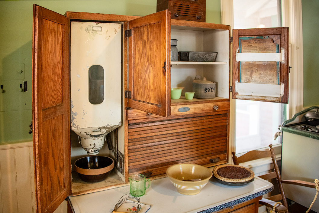 Here we see a kitchen cabinet — different in design but every bit as functional as the ones in my kitchen. The only mystery is the purpose of the metal box on the left. My guess is that it is a flour mill for holding then milling (grinding?) course flour, making it soft and fine for baking those Christmas cookies, etc.
