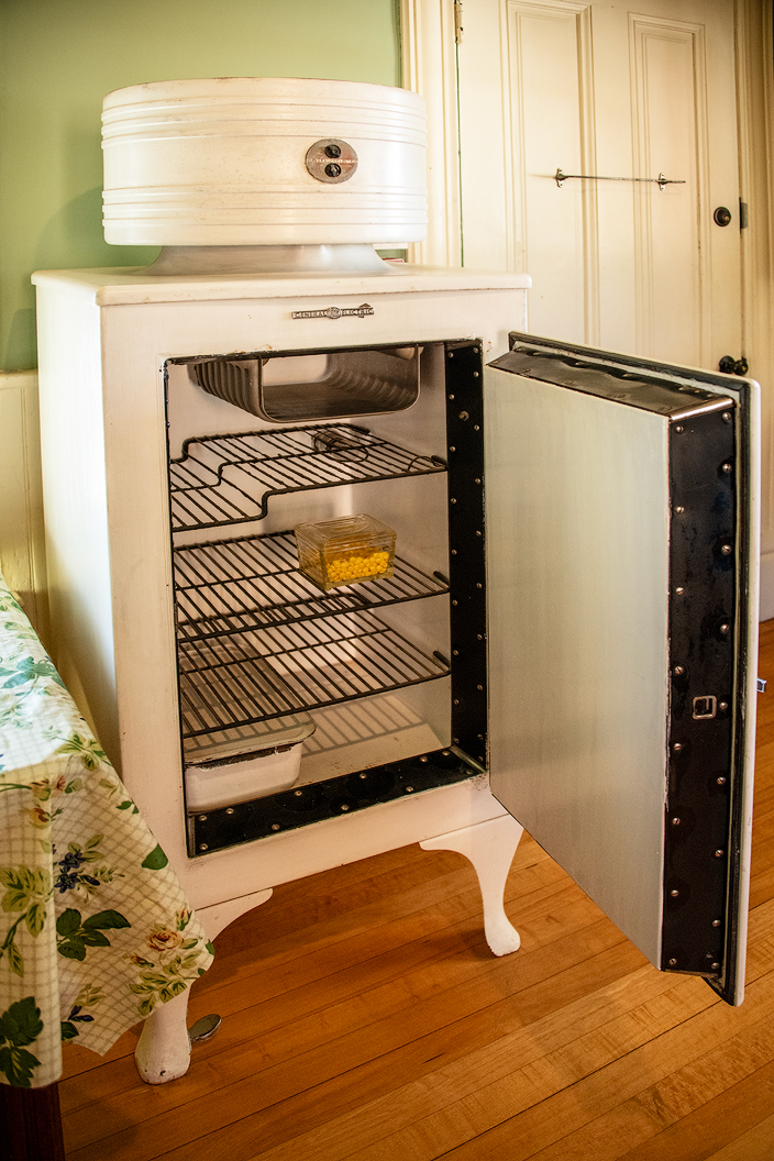 Next up is a vintage refrigerator, only a slight improvement over the previous, commonly used, ice box. I am old enough to recall my family having an ice box when I was very young — with an ice man delivering a big block of ice periodically to provide the chilling for the contents.
