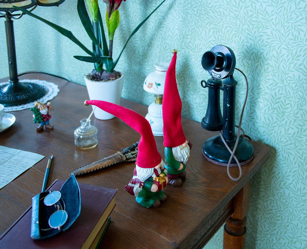 This is the desk in the child's room. Would you believe that this child had his or her own two-piece telephone? Lucky kid! Nice elves too.