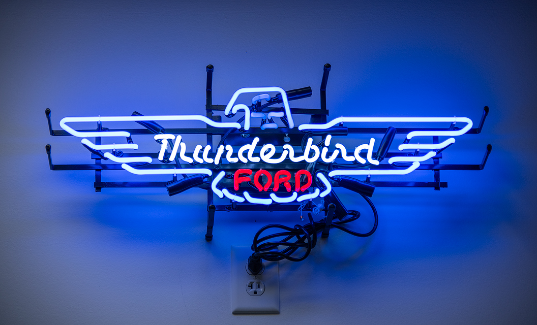 The Ford Thunderbird is one of the most well-known and loved personal luxury cars AKA sports cars ever produced. The logo (depicted here in neon) is one of the most recognized automobile symbols in the industry.