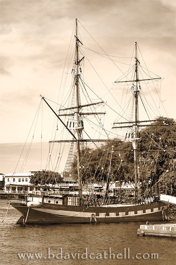 ![]() Carthaginian Sepia The Carthaginian was a sailing ship which was built in 1920 in Germany as a two-master some 30 metres long. It was later converted to diesel power and used to transport cement until decommissioned in 1970. Next the ship was obtained by the Lahaina Restoration Foundation, brought to Maui and restored to the configuration of a whaling supply ship of the 1800s. Once restored, it was moored at this spot in Lahaina and opened for tours as a floating whaling museum. Time took its toll and the vessel became too expensive to maintain so it was sold to Atlantis Submarines and in 2005 was sunk in about 100 feet of water offshore where it rests today serving as a dive destination. Photographer's note: This is more than just a sepia-toned version of a modern photograph. I have worked diligently to remove any traces of contemporary civilization — by eliminating cars, power lines, newer buildings, etc. The goal was to craft a photo that would be very similar to one taken more than 100 years ago. I love the look and I hope you do too. |