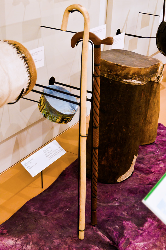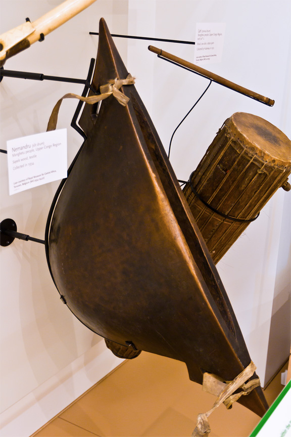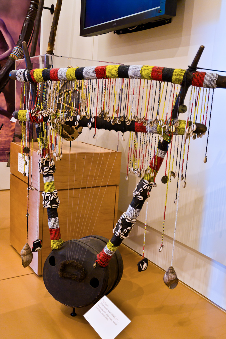 ![]() The lyre, played throughout Sudan, migrated from the Middle East through Saharan Africa and into sub-Saharan Africa. Northern kisir lyres are often played for dance, while those in the south, such as the tom lyre (shown here), accompany bardic poetry and praise songs. The largest country in Africa, Sudan is divided north and south by the Sahara Desert and east and west by the Nile River. The Islamic Arabs of the north use drums such as noba to accompany religious music. Apart from the lyre, the eastern Sudanese Arabs play one-stringed umkiki fiddle, the kurbi harp and a variety of drums. Groups in the southern Sudan are known for ensembles of one-pitched wind instruments such as the now-rare Bongo mandjindji and Dinka side-blown trumpets. I have to say that I was quite impressed with this lyre --- one of my favorite instruments in the entire museum. The ornamentation is outstanding. |