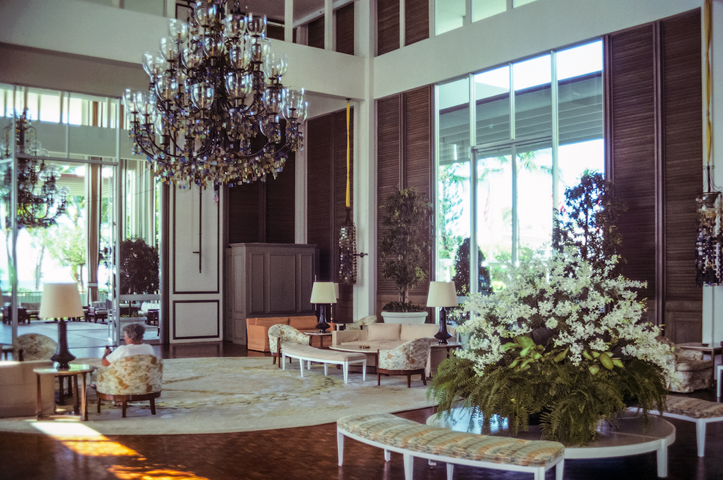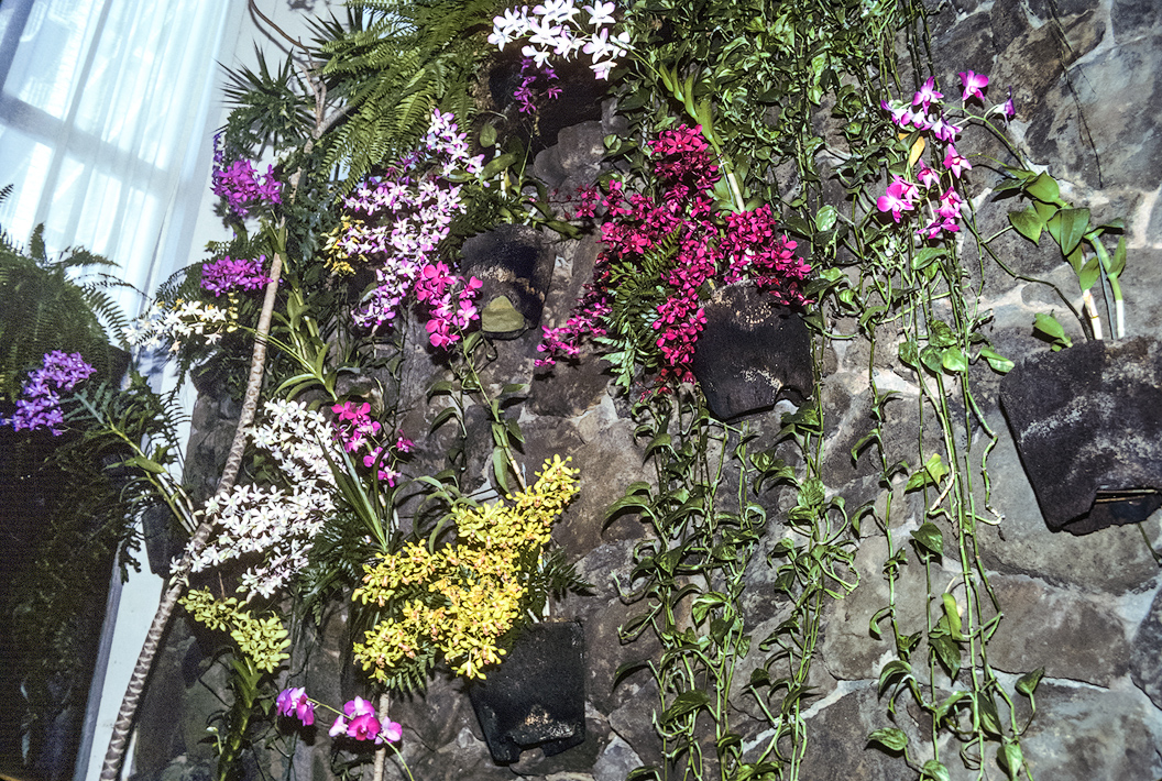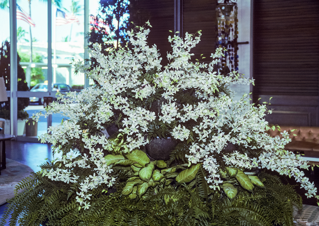 One of the trademarks of the fancy hotels in Hawai’i is the extravagant use of tropical flowers such as this huge spray of orchids...