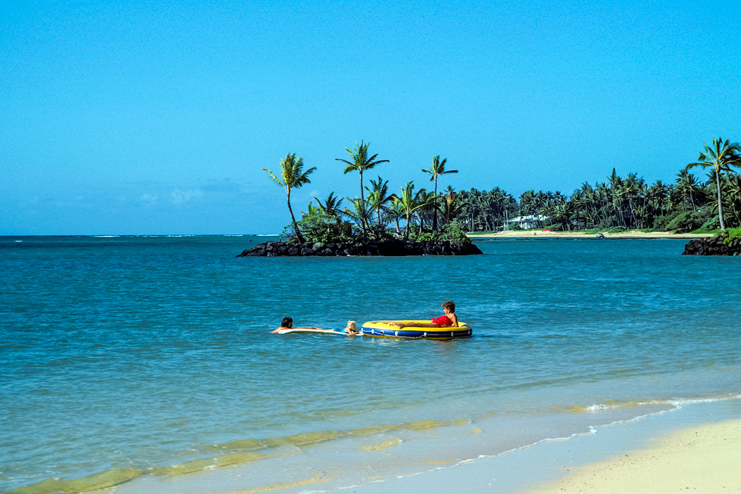 The beach area for the hotel is incredible. Today, I discovered that barges of sand from Moloka’i were shipped over to create the beach. Small peninsulas were added on each end to minimize sand erosion. These lucky folks seemed to have the resulting bay to themselves. In case you're interested, you too could stay in a room with a lanai overlooking the Dolphin Lagoon for only $902 per night for two people — includes breakfast.
