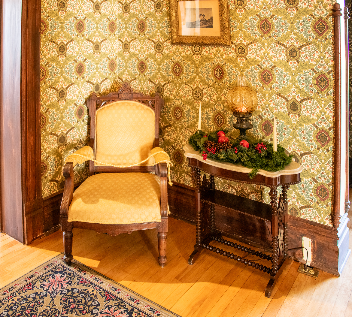 I love the period furniture but when I began processing this photo I spotted a problem I had not seen when I shot it. The picture was crooked! Well, Photoshop to the rescue. It has a new feature that allows me to point to something in the image and designate it as an object. I can then rotate the object so that it is level — and Photoshop changes the picture's perspective and fills in the wallpaper pattern in areas that had been previously covered. How could that program be so smart? I don't know but I love it.