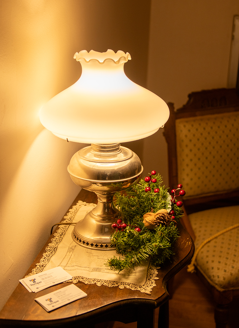 In the hallway leading to the stairs, one finds a small table with a lamp and a few sprigs of holiday greenery. Lovely.
