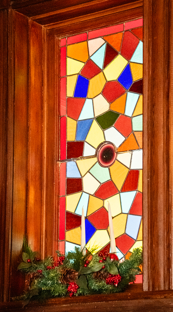 Going up the stairs we found another stained glass window — this one with exterior light brightening the colors of the stained glass. I love it!