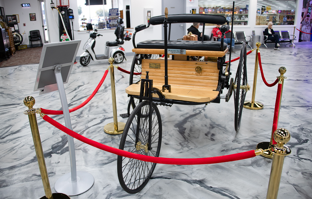 1886 Benz Motorwagen (Replica) The Benz Patent-Motorwagen (built in 1885), is widely regarded as the world's first piston-powered production automobile. On January 29, 1886, Karl Benz patented the three-wheeled Patent-Motorwagen (patent number 37435). Later in the same year, just 60 miles away, Gottlieb Daimler patented an internal combustion engine and began with the construction of a four-wheeled horseless carriage. Neither Benz nor Daimler were aware of the other's work.