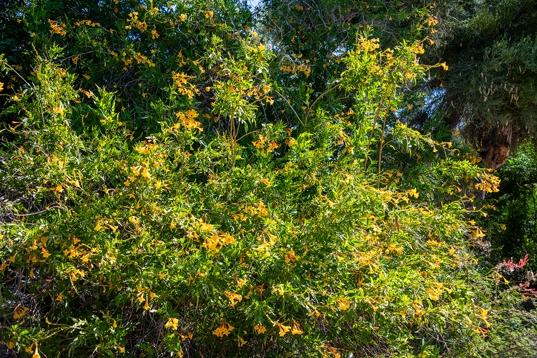 Next up is a massive Yellow Bells (Tecoma stans) plant. This is a popular plant in the Lowe's garden because it can tolerate the hot Arizona sun in mid-summer. In fact, the highway department plants many of these along Arizona freeways — they do not want a plant that needs care and attention other than automatic watering. I often recommend that our customers note the types of plants along the freeways, for that very reason — those plants are candidates for Phoenix residential landscaping as well.