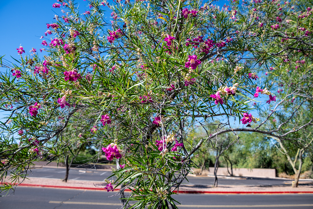 Here we see one of my favorite desert trees — the Desert Willow creates interest in the way of color, form, and size. It is a unique shrub or tree that is low maintenance and tolerant of extreme heat and drought, and it thrives in a well-draining site in many types of soil. It does this all while attracting butterflies, bees, and birds.