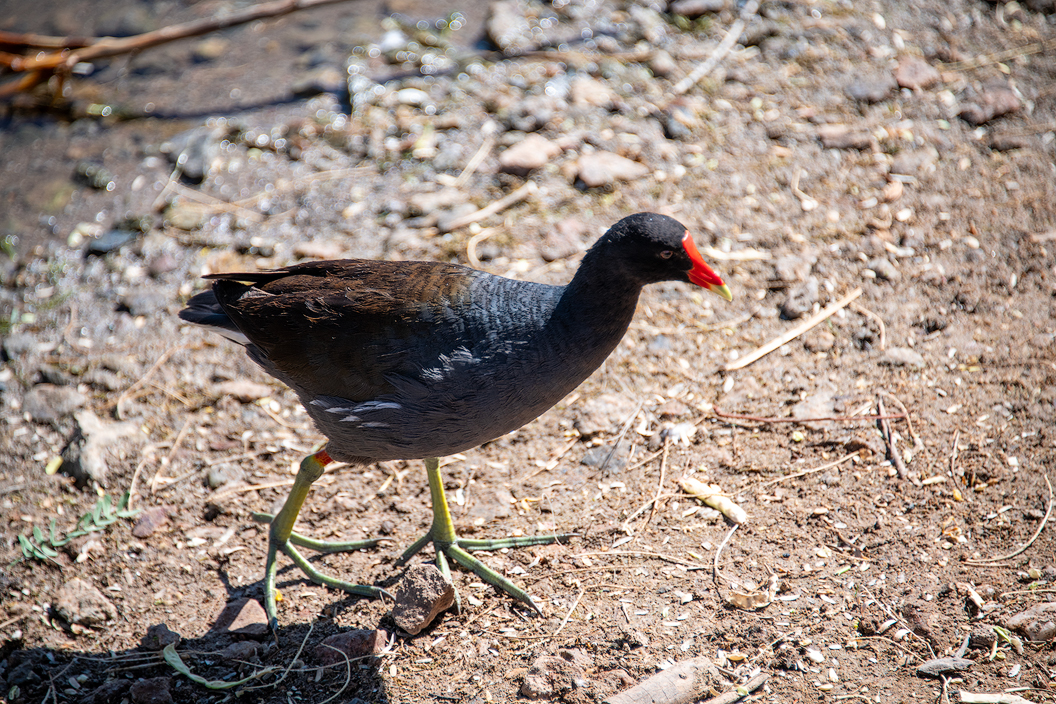 Fortunately, the one closer to me came closer still and I was able to get a nice photo of a Common Gallinule (identification compliments of Safari's database). The Cornell Lab of Ornithology provided additional details — "The Common Gallinule swims like a duck and walks atop floating vegetation like a rail with its long and slender toes. This boldly marked rail has a brilliant red shield over the bill and a white racing stripe down its side. It squawks and whinnies from thick cover in marshes and ponds from Canada to Chile, peeking in and out of vegetation".