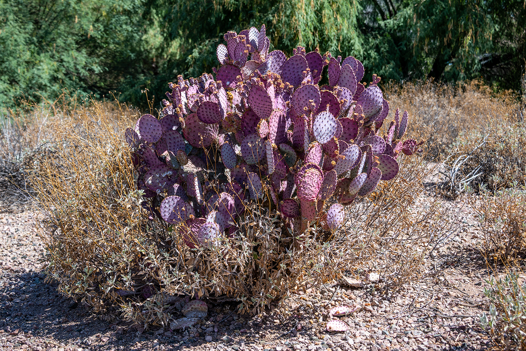Another beautiful Prickly Pear cactus — this one with a lovely purple hue. When you think of cacti, you think green or maybe green and brown. You might even think of the lovely flowers — perhaps white or yellow or red — those add to the ambiance. Even though this one is not stereotypical, I like it just the way it is.