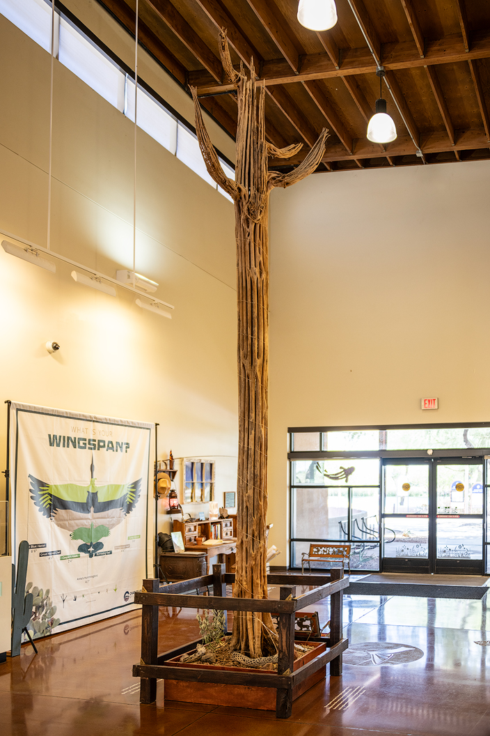Back inside, I browsed the nature displays showing desert flora and fauna — the most impressive of which was the skeleton of a giant saguaro cactus. Arizonans generally know that when the green outside of this particular cactus dies and falls away, what remains is what looks like strands of wood bundled together, including the side branches seen at the top. I can almost hear the tourists and new residents looking at it and saying, "What's that?"