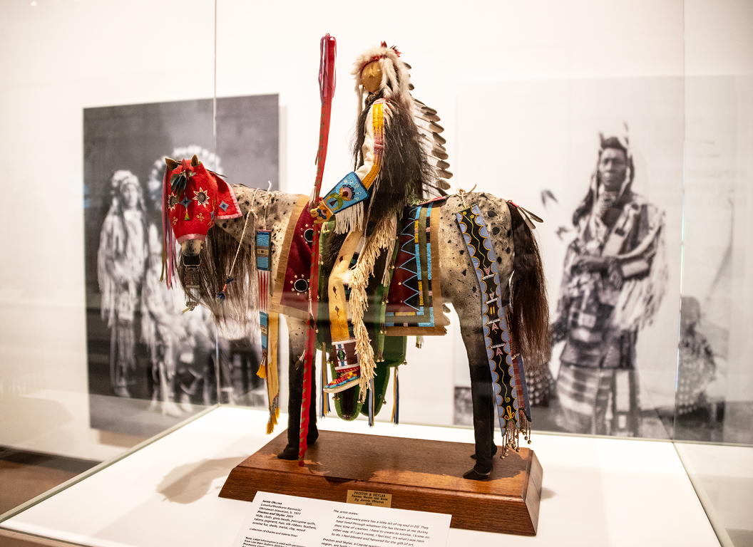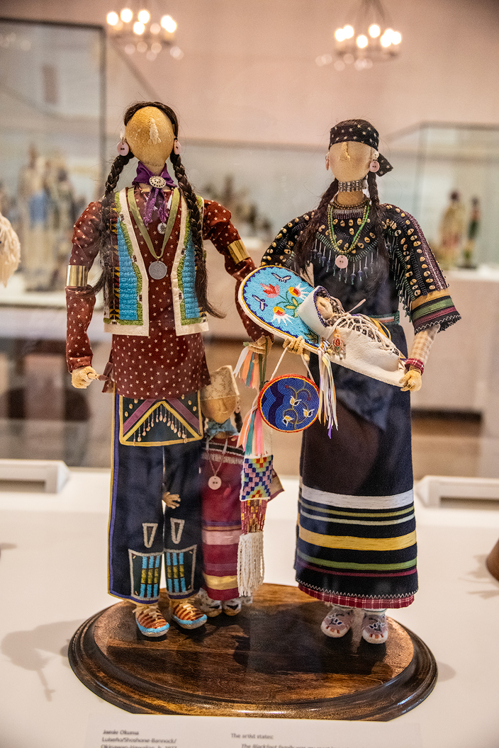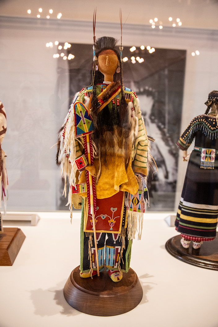 I turned to look at a plexiglass case just behind me to see my first soft sculpture, "Oren, Crow Warrior" by Jamie Okuma, Okinawan-Hawaiian. Oren represents a proud Crow warrior in his glorious assemblage. On his back, he wears an otter skin arrow quiver case while holding a mirror bag and traditional lance. His headdress, long hair, and hairstyle clearly identify Oren as Crow. For this piece, Okuma was awarded the prestigious Best of Show ribbon in 2000 at SWAIA's Indian Market in Santa Fe.
