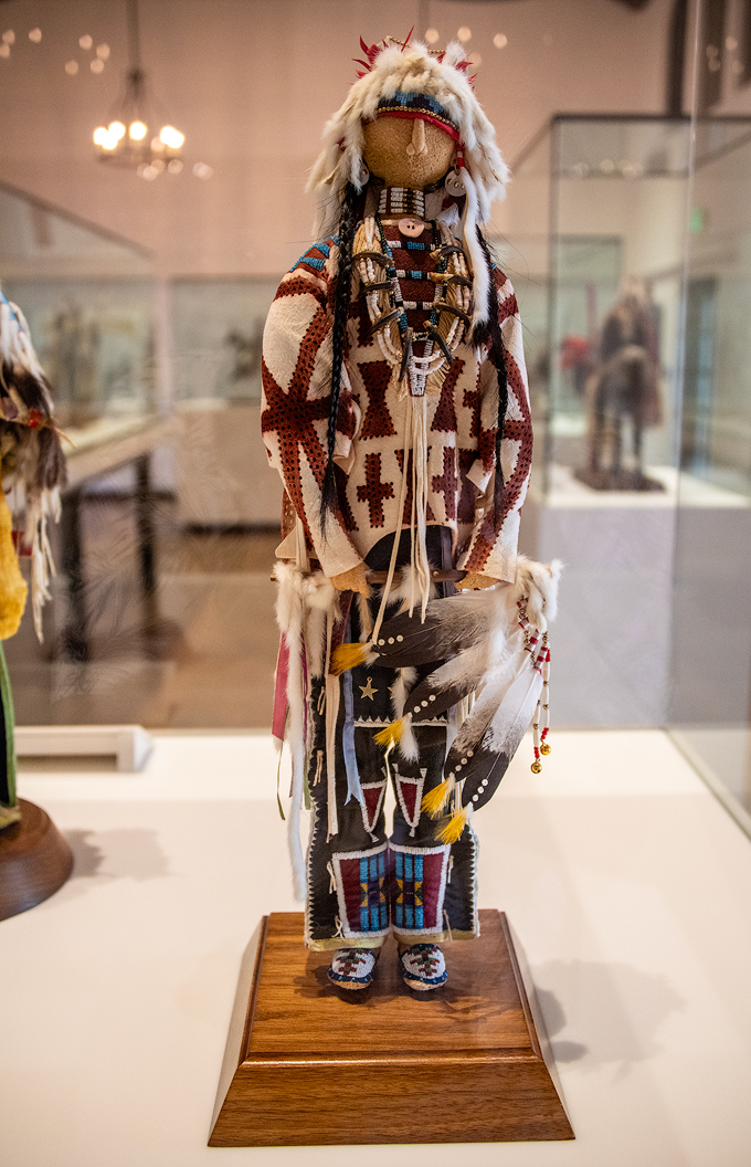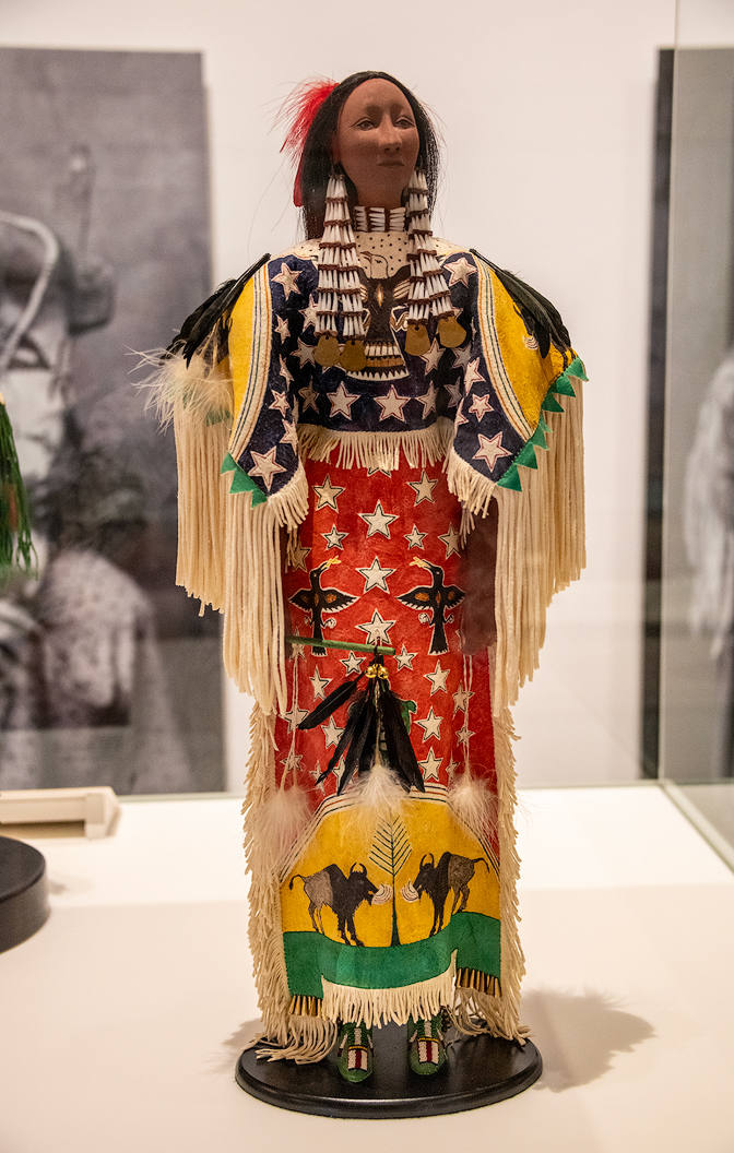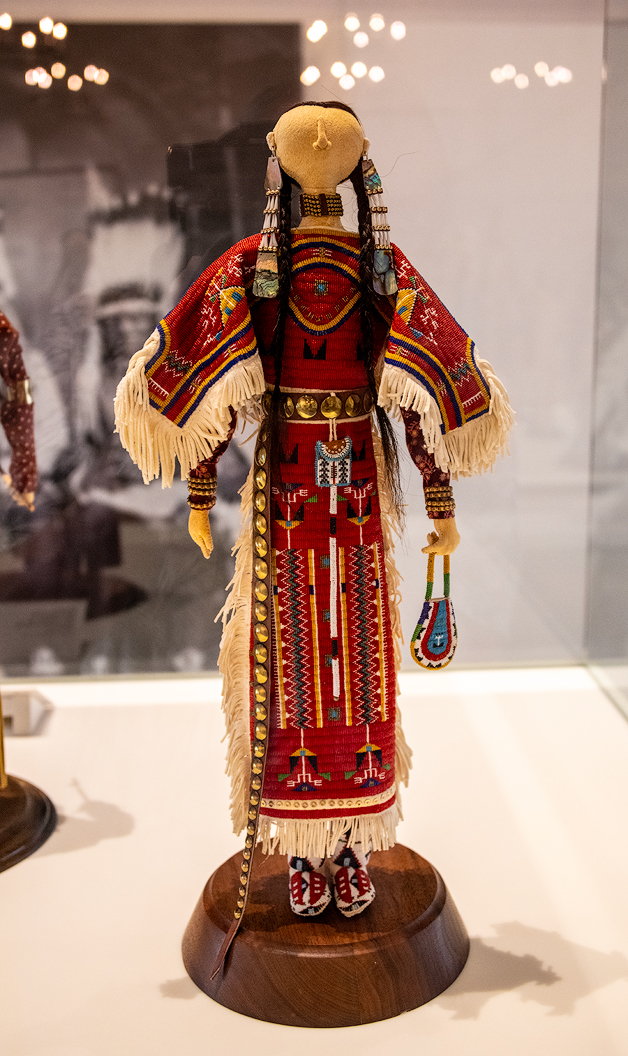 This is "Lady in Red, Lakota Woman" by Okuma. This fully beaded dress with complex geometric designs is complemented by shell earrings, a choker, a concho disk belt, a beaded handbag, and beaded moccasins. A calico dress is worn underneath. The entire outfit represents Northern Plains women's ceremonial clothing of the late 19th century.