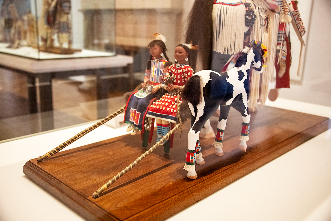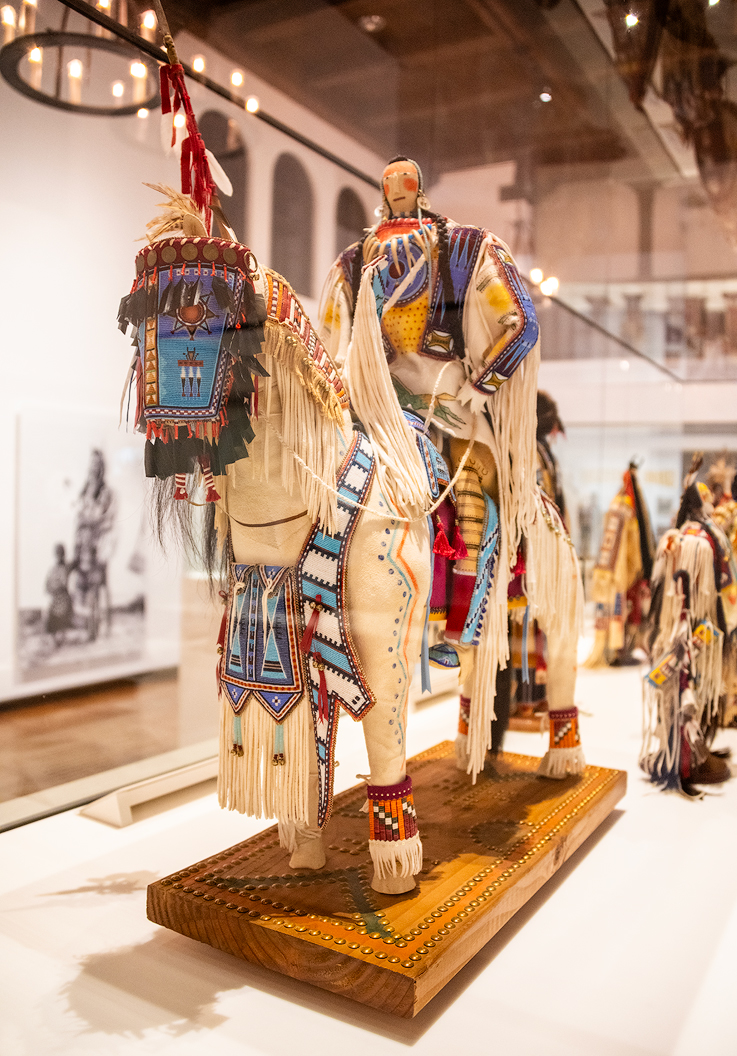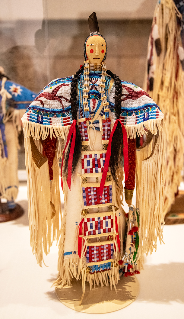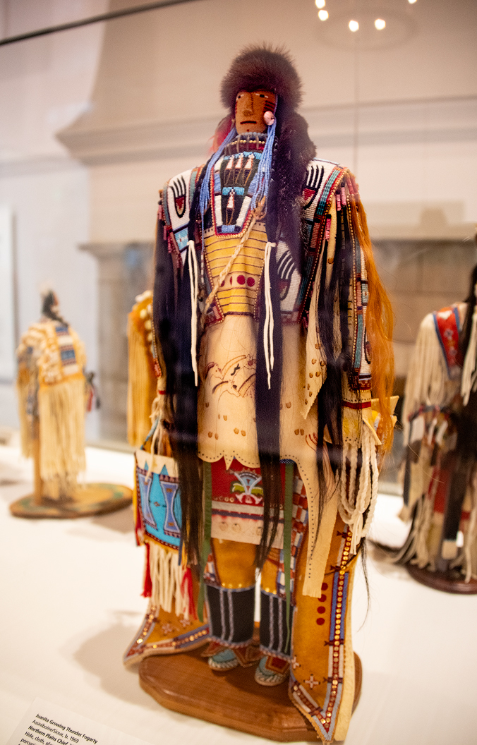 Juanita Growing Thunder Fogarty calls this piece "Sioux Woman. The beaded horse imagery on the yoke honors the importance of horses to the Plains people. A charming addition is the use of brass sewing thimbles for bracelets. Underneath the hide dress is another one of calico, a typical clothing style of the late 1800s to the early 1900s. On her back is a fully beaded cradleboard.