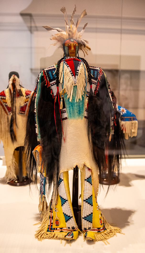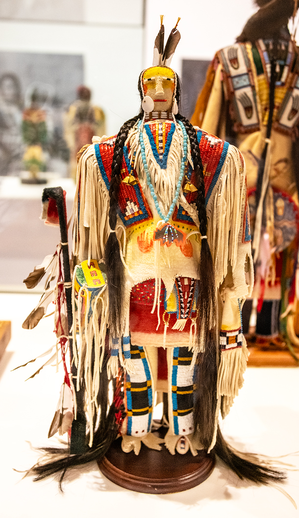 This piece by Joyce Growing Thunder Fogarty is entitled "Netacoda" and is a classic 19th-century Plains warrior style of dress. The beautifully painted shield on the warrior's back displays a buffalo head with emanating power lines, buffalo hooves, and a crescent moon. Shield imagery was a supernatural power received by a warrior in a dream or vision quest. Although a thick hide shield might deflect arrows in battle, its greater value was the spiritual protection given to the individual through the designs.