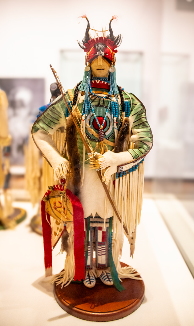 The artist, Juanita Growing Thunder Fogarty, states: "The chief has bear medicine. I was not honoring anyone specific; it was just a concept in my mind. The hair is human hair bought from a wig store. When mom first started making the figures she used our hair, but that was not going to work for very long."