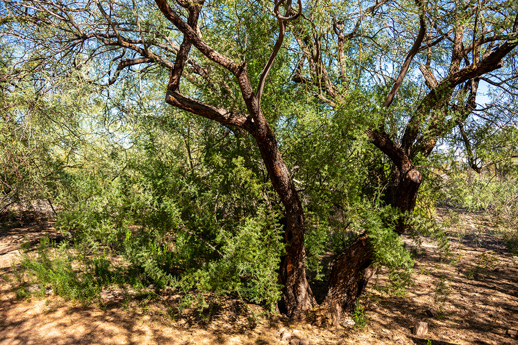 From Wikipedia: "Mesquites grow as a small shrub in shallow soil or as tall as 50 feet (15 m) in deep soil with adequate moisture, and form a rounded canopy nearly as wide. They may have one or multiple trunks with a multitude of branches. They have bipinnate leaflets of a light green to blue hue that cast a light to deep shade, depending on the species. Spikes of flowers form in spring and summer that form a flat pod of beans 2 to 6 inches (5 to 15 cm) long. Many varieties form thorns. When cut to the ground, the tree can often recover."