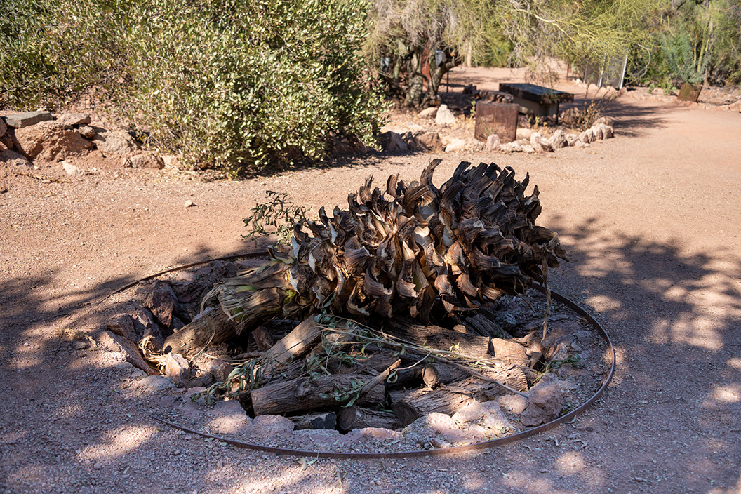 This is an agave roasting pit. For centuries, agave has been roasted for food in pits like this by people in the Sonoran Desert. Before roasting, the leaves are removed to expose the heart. Agave hearts are then sandwiched between layers of vegetation on top of hot coals and baked for up to four days.