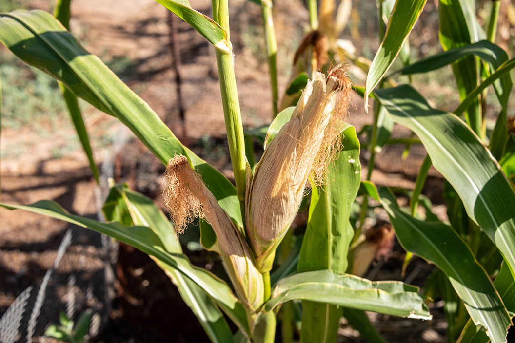 This is a close-up of the corn planted here. Note that this is more like the field corn used today to feed livestock — not the sweet corn that we enjoy each summer. Corn, also known as maize, was an important crop to the Native American Indians. Eaten at almost every meal, this was one of the Indians' main foods. Corn was found to be easily stored and preserved during the cold winter months. Often, the corn was dried to use later. Dried corn was made into hominy by soaking corn in water until the kernels split open. These would be drained and fried over a fire.