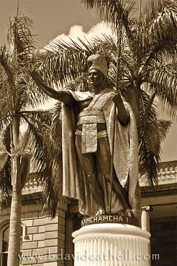![]() King Kamehameha Statue King Kamehameha the Great united the Hawai`ian Islands and formally established the Kingdom of Hawai`i. He was raised in the royal court of his uncle and eventually gained control of the Big Island. With help from British and American traders who provided guns and ammunition, Kamehameha quickly conquered lightly defended Maui and Moloka`i. O`ahu provided greater resistance but ultimately fell. Only Kaua`i and Ni`ihau remained but eventually agreed to recognize Kamehameha's sovereignty. As the first King of Hawai`i, Kamehameha unified the legal system and promoted trade with the United States and Europe. Non-Hawai`ians were not allowed to own land which helped the island kingdom retain its independence. King Kamehameha ended human sacrifice but otherwise continued to follow the Hawai`ian religion and traditions. Even today he is much beloved and is honored with a holiday on June 11 when this status is festooned with hundreds of flower leis. Photographer's note: This is more than just a sepia-toned version of a modern photograph. I have worked diligently to remove any traces of contemporary civilization — by eliminating cars, power lines, newer buildings, etc. The goal was to craft a photo that would be very similar to one taken more than 100 years ago. I love the look and I hope you do too. |